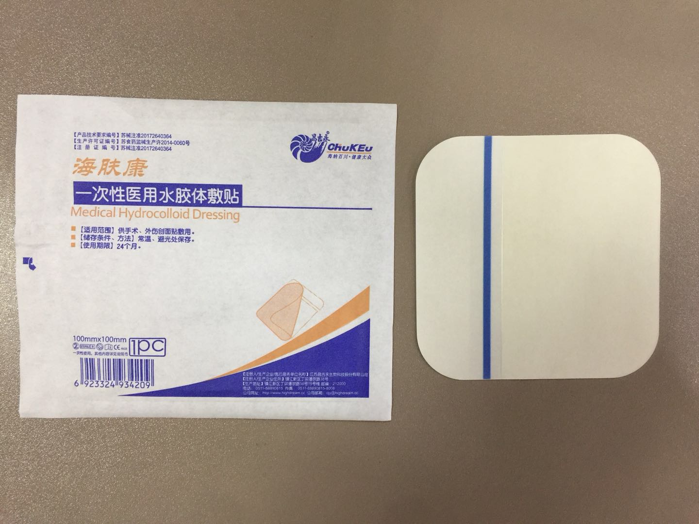 一次性医用水胶体敷贴由背衬基材、水胶体涂层、隔离层组成;其中背衬基材采用聚氨酯膜制成,水胶体层由医用压敏胶和羧甲基纤维素钠颗粒组成,隔离层是由格拉辛纸或双面硅纸(CCK纸)制成;根据尺寸不同分为8个规格。产品经钴-60辐照灭菌,应无菌。