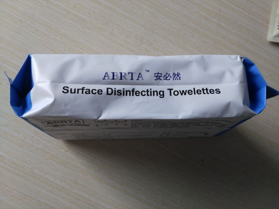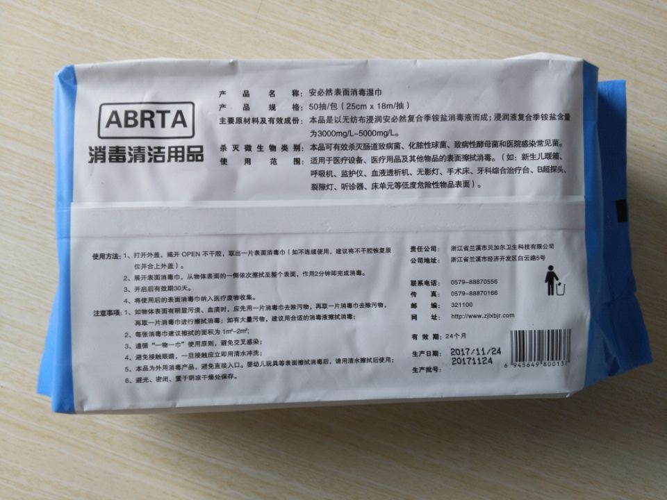 主要原材料及有效成分:本品是以无纺布浸润安必然牌季铵盐消毒液而成;浸润液复合季铵盐含量为1.8g/L~2.2g/L.