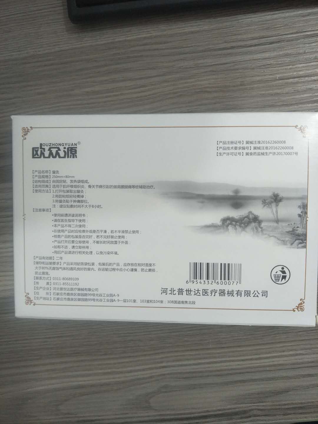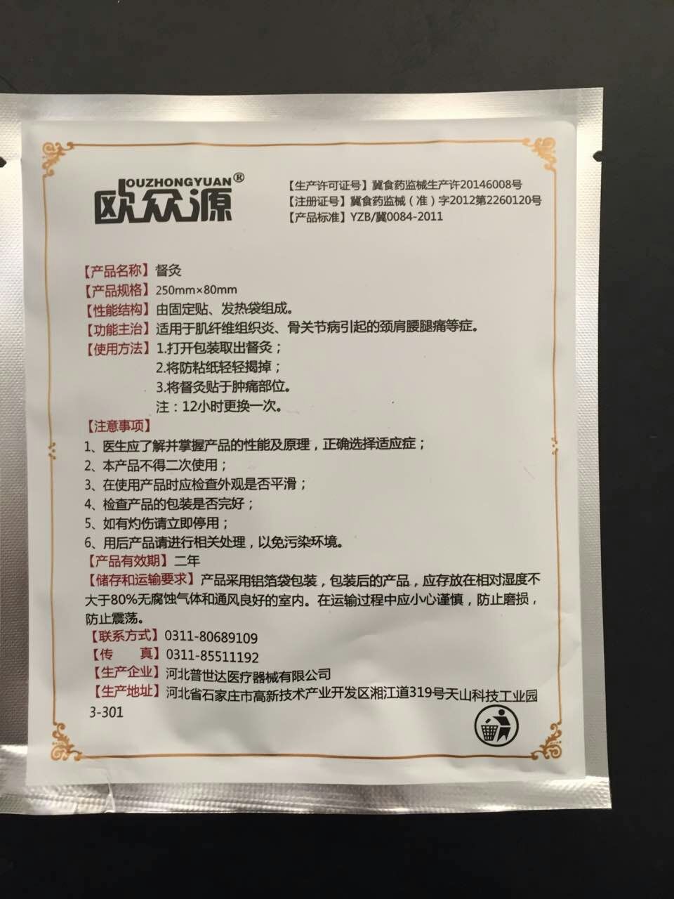 督灸由固定贴、发热袋组成。固定贴采用胶带、防粘纸组成;发热袋由铁粉、无机盐、活性炭、水、硅藻土组成。发热袋内容物装量分为:25g、35g、40g。