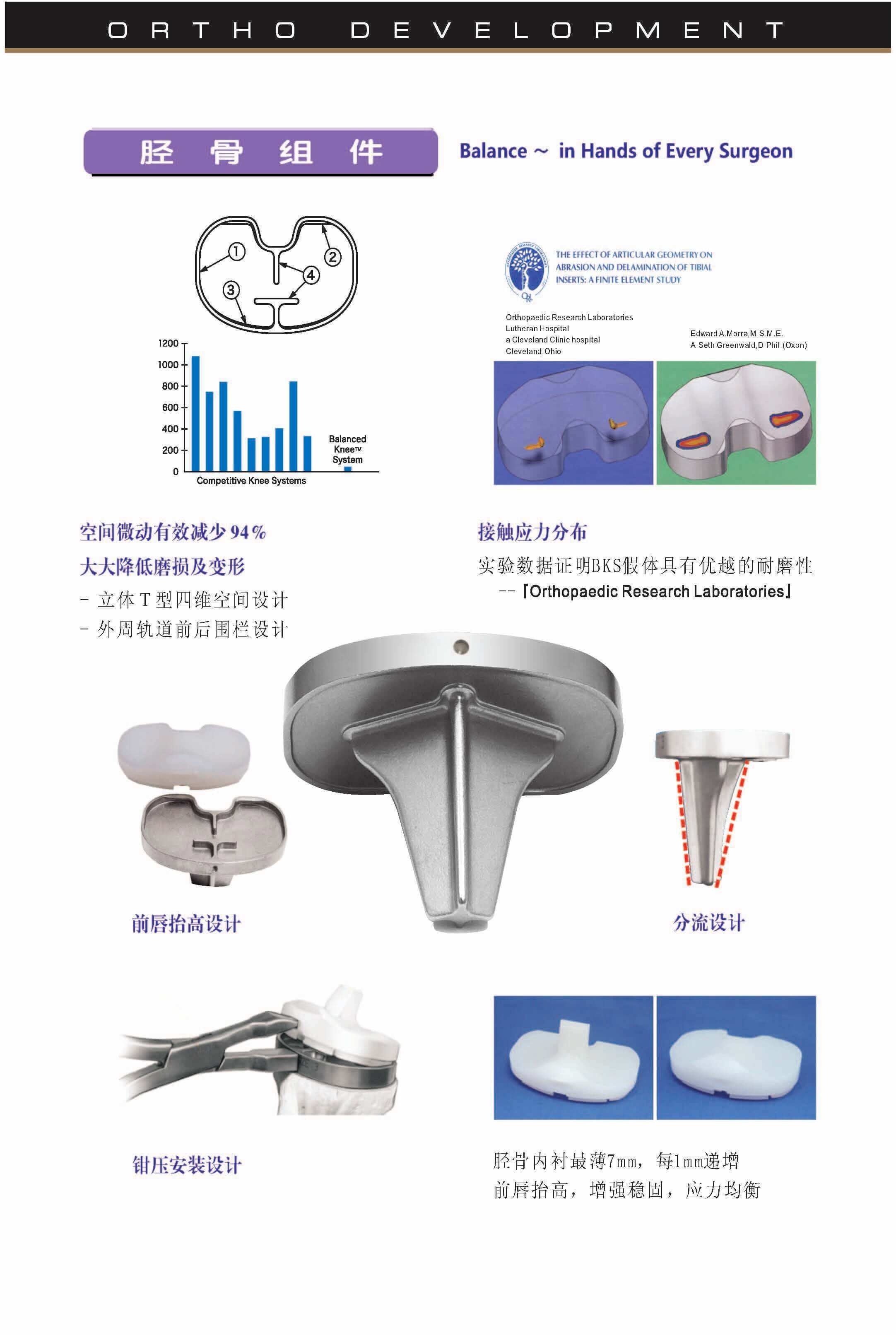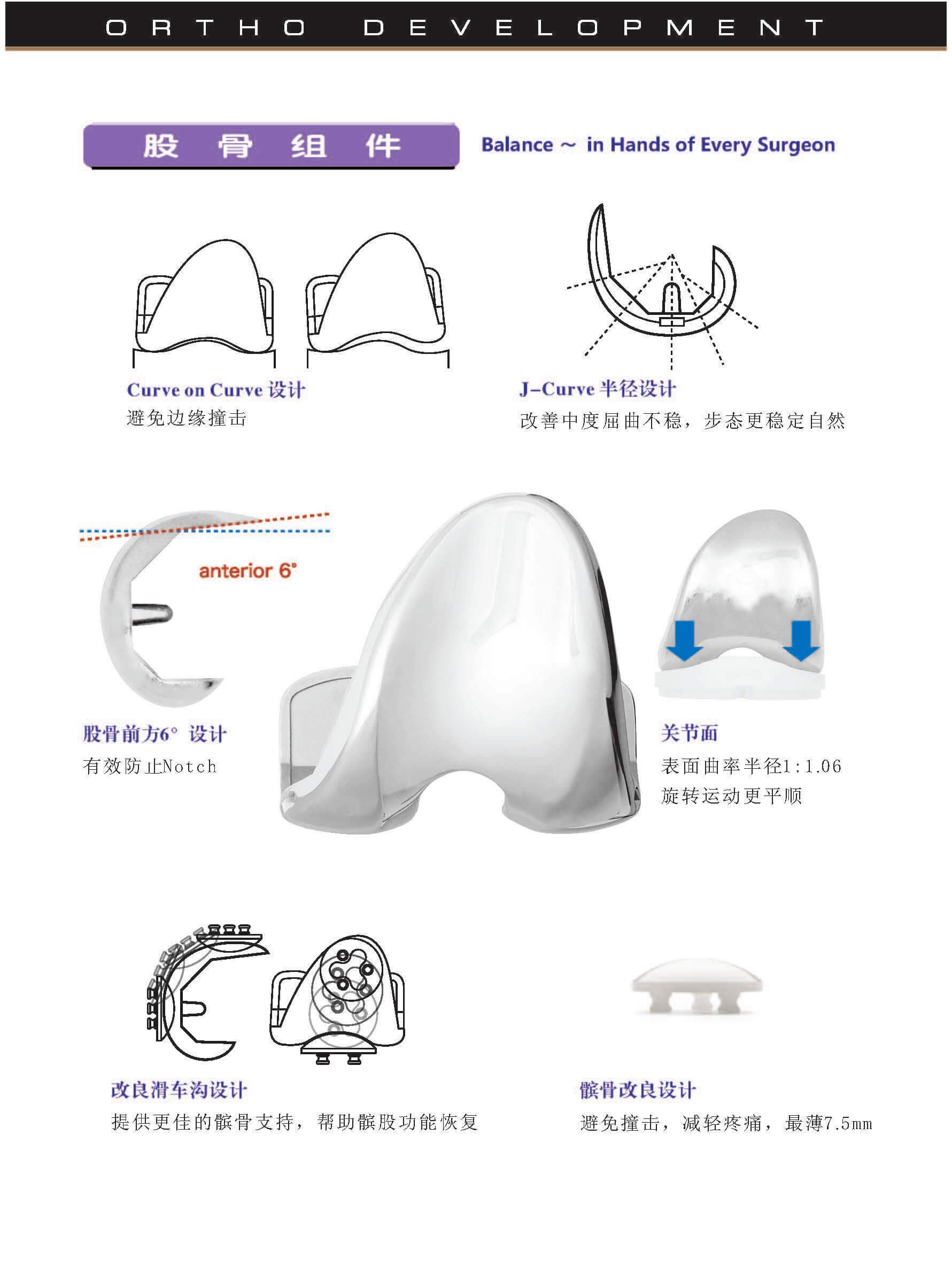 ③设计亮点:Curve on Curve设计有效避免边缘撞击;J-Curve半径设计可改善中度屈曲不稳;股骨前方6°设计有效防止股骨前方Notch;改良滑车沟设计提供更佳的髌骨支持; 钳压安装设计、分流设计设计,为膝关节的稳定保驾护航,并大大降低磨损,更安全,更持久。
