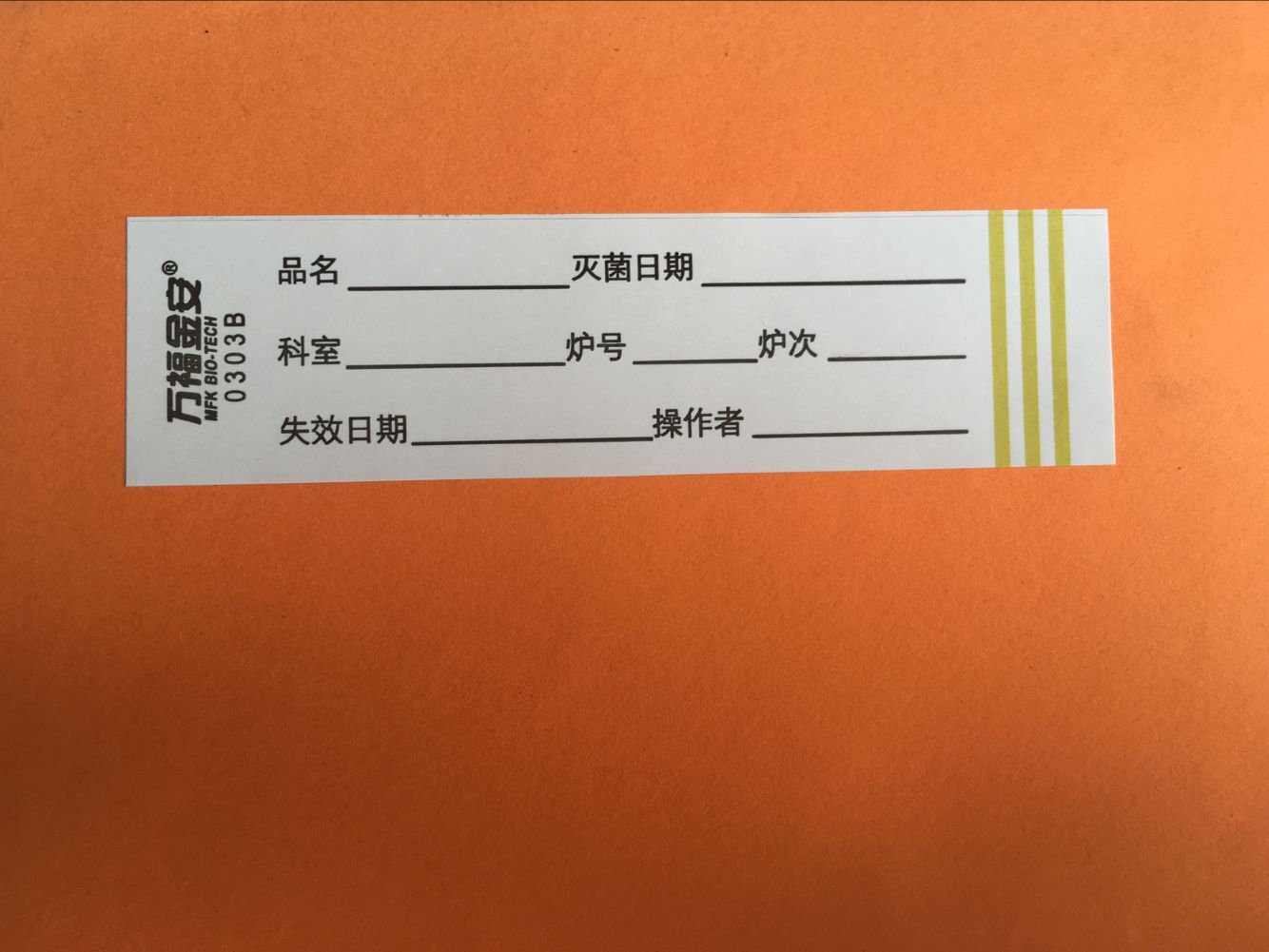 本品是专用于压力蒸汽灭菌标签,标签表面印有文字或可打印条形码、二维码等内容,记录灭菌物相关参数,日后检测和追溯,在饱和蒸汽的湿热作用下,胶水适用于粘贴于棉布和无纺布表面,不残胶、不脱落。