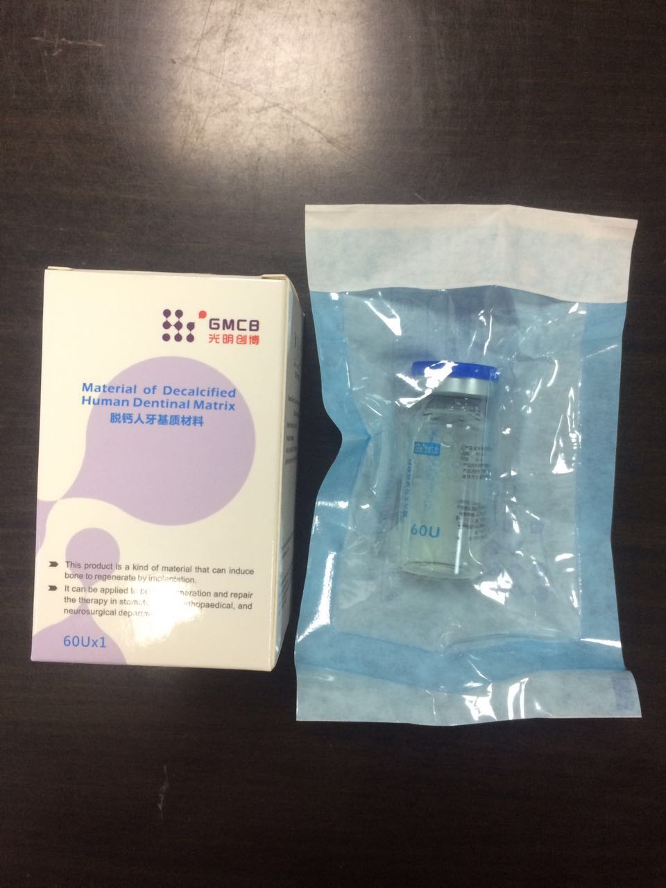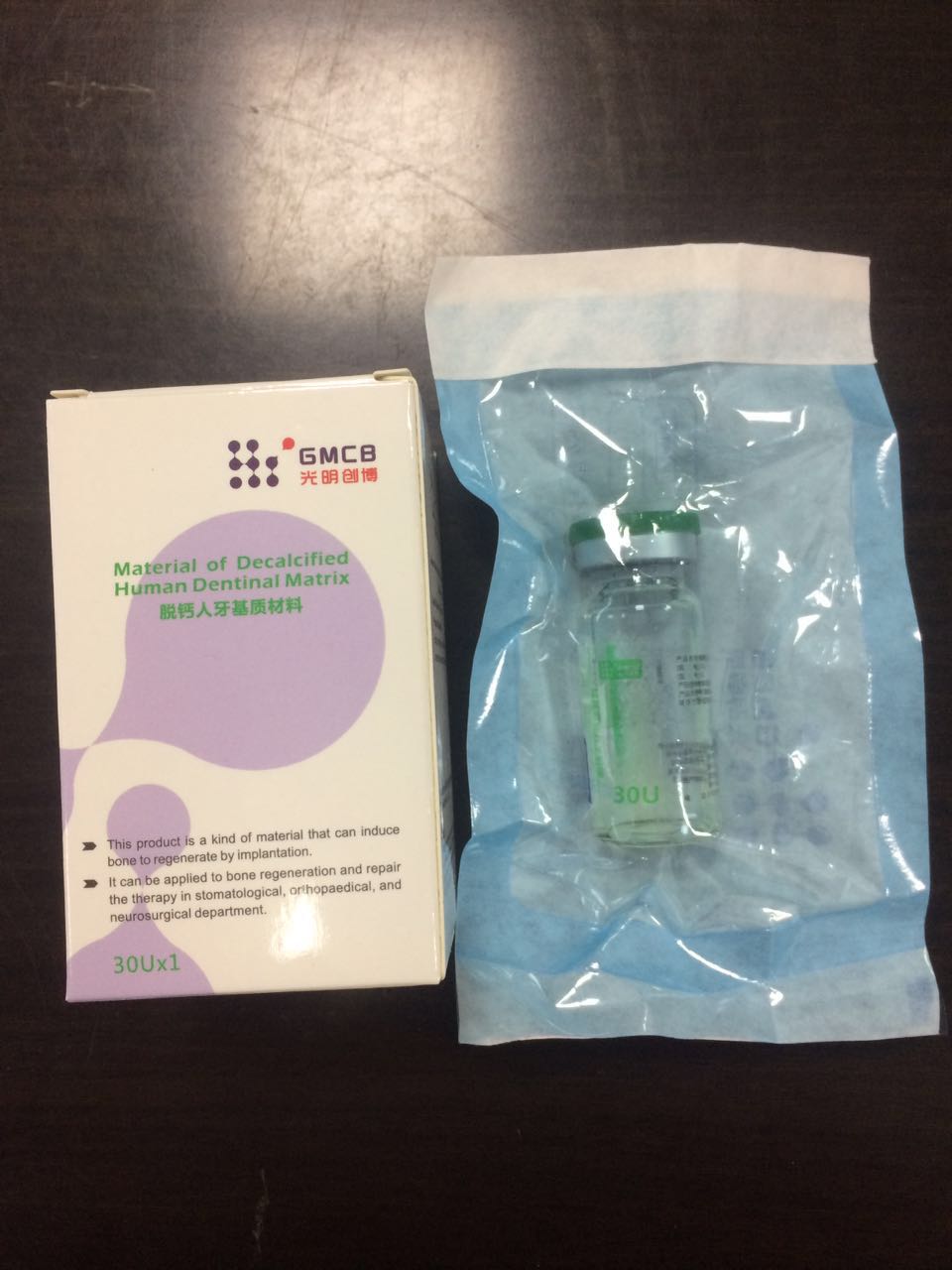钙人牙基质材料----该产品系选用口腔治疗拔除的各类人牙(废弃牙)为原料,主要经粉碎、脱脂、脱钙、病毒核酸灭活等工艺加工而成。高压蒸汽灭菌。是一种可降解吸收含骨形态发生蛋白(BMP)的同种生物活性骨诱导材料。适用于治疗各类长骨、扁骨的新鲜及陈旧性骨缺损,骨不连,粉碎性骨折,骨质吸收,骨延迟愈合。主要在骨科、脑外科、口腔科,用于骨修复治疗。