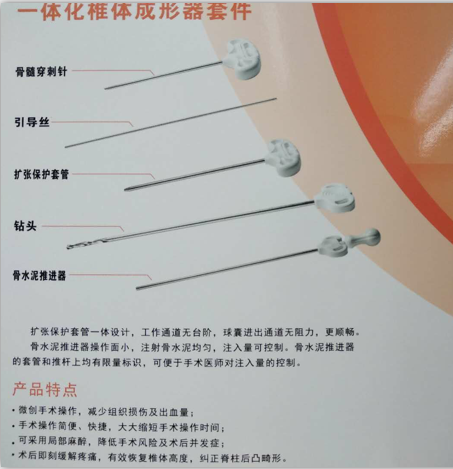 该产品适应证分型等级为A1.3椎体塌陷,适用于治疗椎体肿瘤及骨质疏松症引起的压缩性骨折,作经皮椎体成形术和经皮椎体后凸成形术手术时配套使用的微创手术器械。匹配使用骨水泥为不透射线低粘度骨水泥。