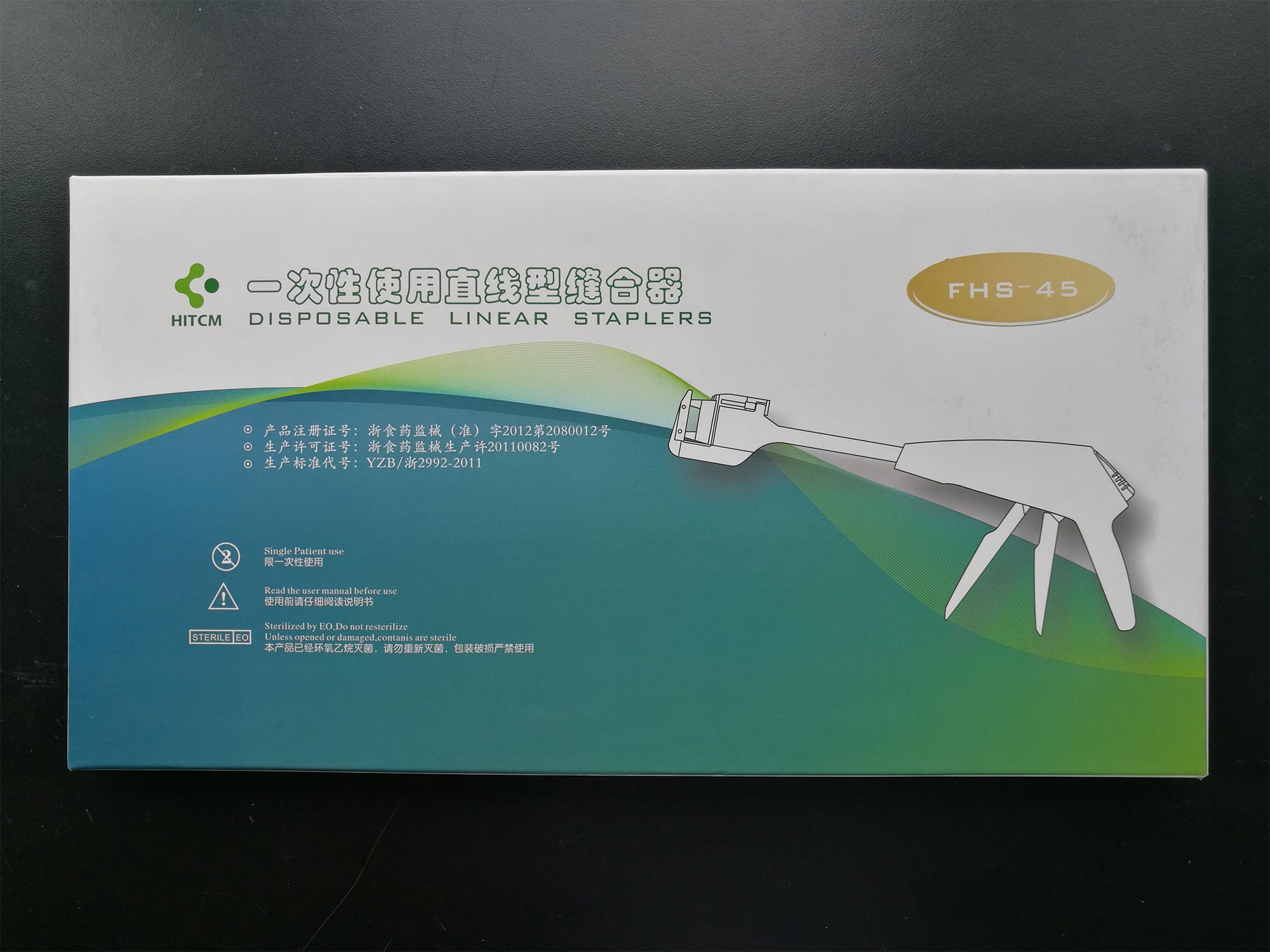 一次性使用直线型吻合器及组件的工作原理与订书机相同,即向组织内击发植入两排互相交错的缝合钉对组织进行双排交叉钉缝,缝合严密,防止渗漏;由于小血管可以从“B”形缝合钉的空隙中通过,故不影响缝合部及其远端的血液供应。与手工缝合线相比,组织反应小;由于缝合钉排列整齐,间距相等,避免了手工缝合过疏过密和接扎过紧过松,因此保证了组织的良好的愈合。