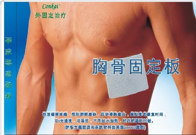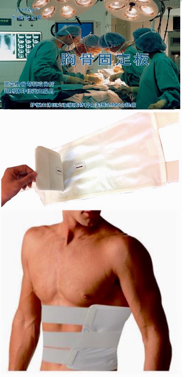 胸骨固定板以手术切口为中心形成刚性板状结构,该结构的主要功能是:限制受损肋骨及周围软组织的运动,保持胸壁形态、大大缓解疼痛并减少了对止痛药物的使用及对止痛药物的依赖,促进伤口愈合、有利于咳嗽排痰、迅速恢复呼吸功能、预防肺部感染,从而缩短康复时间。