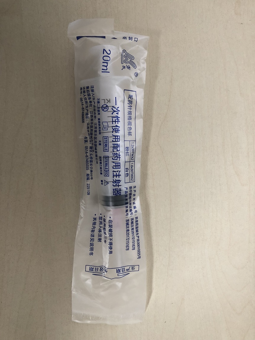 一次性使用配药用注射器由外套、芯杆、活塞、配药针组成。外套、芯杆采用符合YY/T0242-2007《医用输液、输血、注射器具用聚丙烯专用料》制成;活塞由符合YY/T0243-2016《一次性使用无菌注射器用橡胶活塞》材料组成;配药针针管采用符合GB/T18457-2015《制造医疗器械用不锈钢针管》中的06Cr19Ni10奥氏体不锈钢制成。一次性使用配药用注射器按公称容量不同分三个规格,分别为20ml、30ml、50ml。配药针针管按针尖型式分侧孔针(CZ1.2*30、CZ1.6*30)和斜面针(XZ1.2*30、XZ1.6*30)两种;按壁管分薄壁(TW)、正常壁(RW)。产品经环氧乙烷灭菌,产品应无菌。