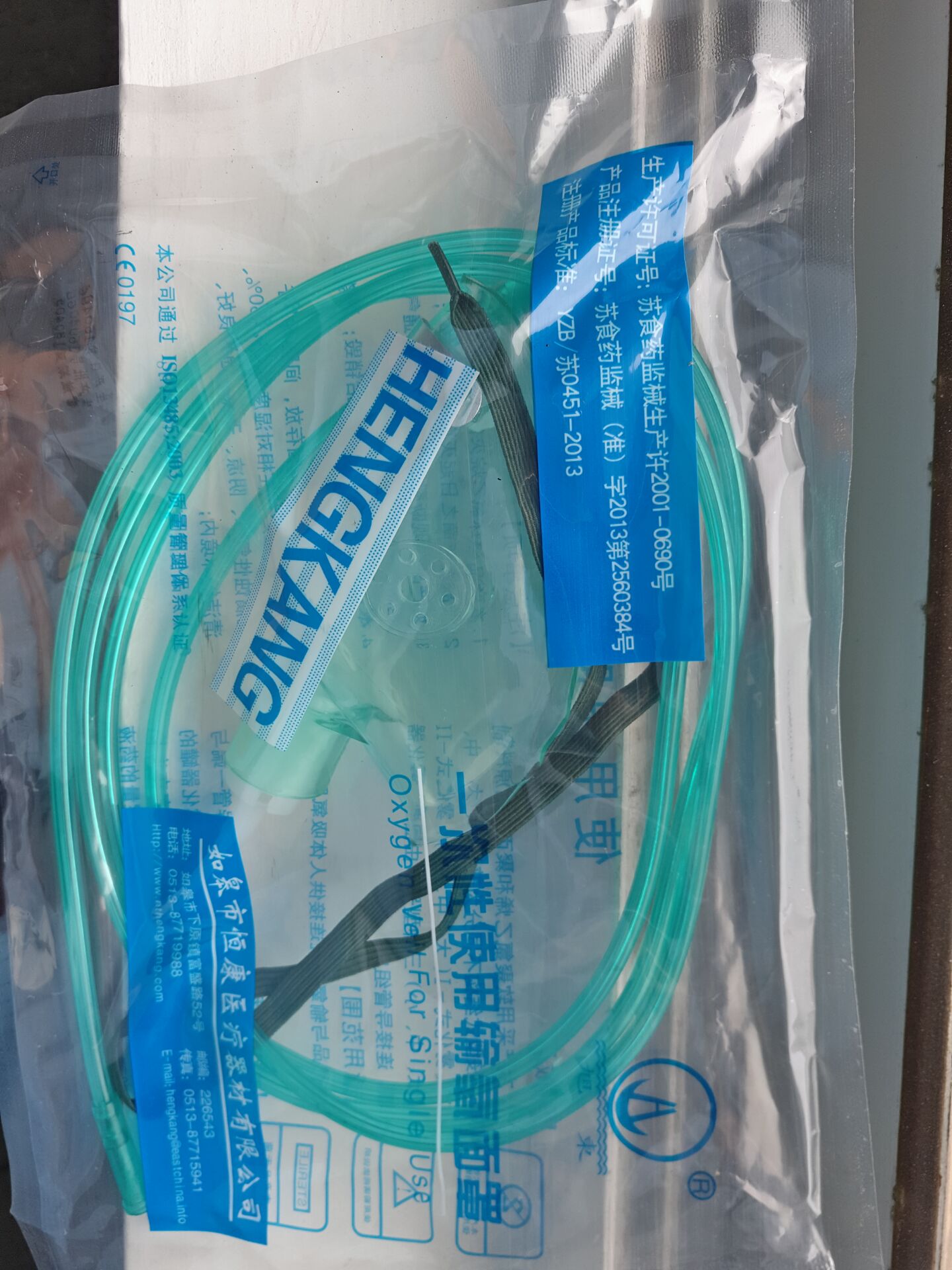一次性使用输氧面罩主要由连接导管、面罩、雾化器罐等组成,按结构不同分为普通式、雾化式-I、雾化式-II三种型号,面罩和连接导管采用GB15593-1995输血(液)器具用软聚氯乙烯为原料、雾化器罐采用YY0242-1996医用输液、输血、注射器用聚丙烯专用料为原料制成。本产品经环氧乙烷灭菌,应无菌。
