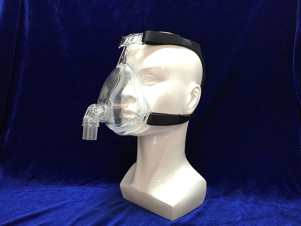 由面罩或鼻罩(材质:硅胶)、面罩或鼻罩框架(材质:PC或PP)、头带(材质:莱克布和丁苯橡胶发泡体)、头带扣(材质:PC或PP)、L接头(材质:PC)和气源接头(材质:PC)组成,产品未灭菌。