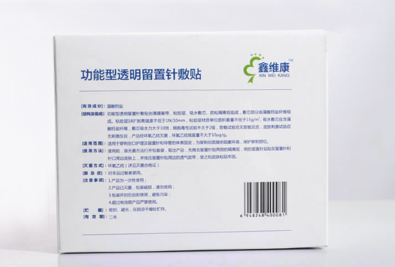 [产品性能] 功能型留置针贴敷芯部分为藻酸钙盐纤维组成,藻酸钙盐中的钙离子在伤口表面形成一层网状凝胶有助于了解创口的渗液情况,预防创口感染。