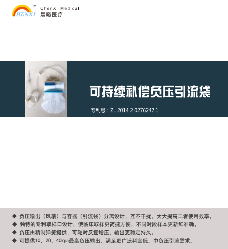 1.负压输出(风箱)与容器(引流袋)分离设计,互不干扰,大大提高二者使用效率