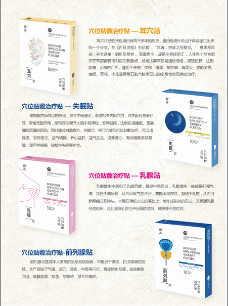 由施加压力的球状体压珠、压珠固定贴和医用胶带组成。贴于人体穴位处,通过外力刺激作用达到缓解病症的目的。