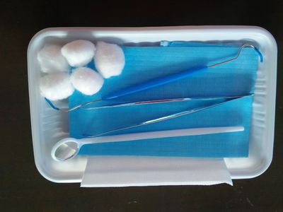 供医疗单位口腔治疗时用,口镜用于口腔检查。牙探针用于探查牙面、牙龈等部位的病灶。牙科镊用于口腔科检查和治疗时夹持。聚酯衬垫对病人提供一般性防护,以免受其其他器械或外界的伤害。