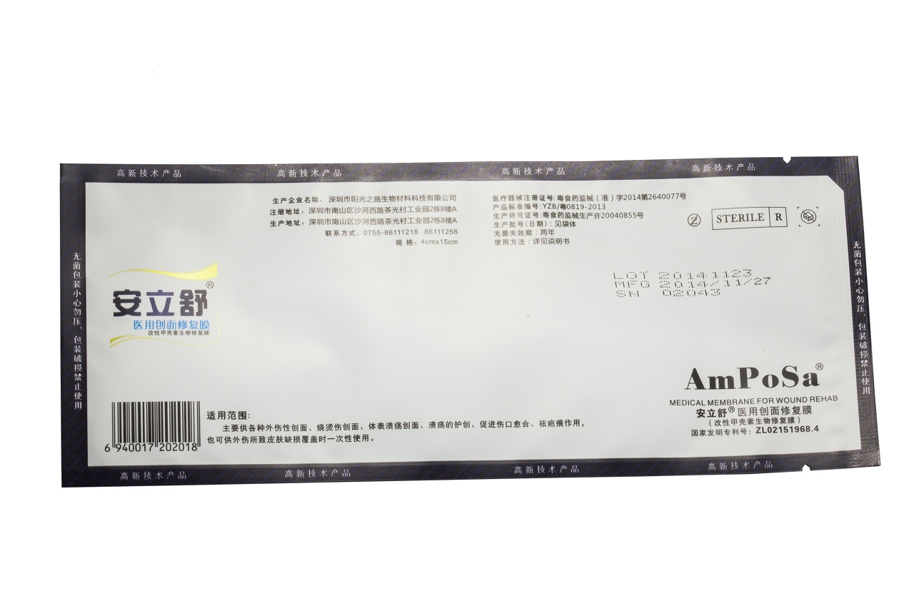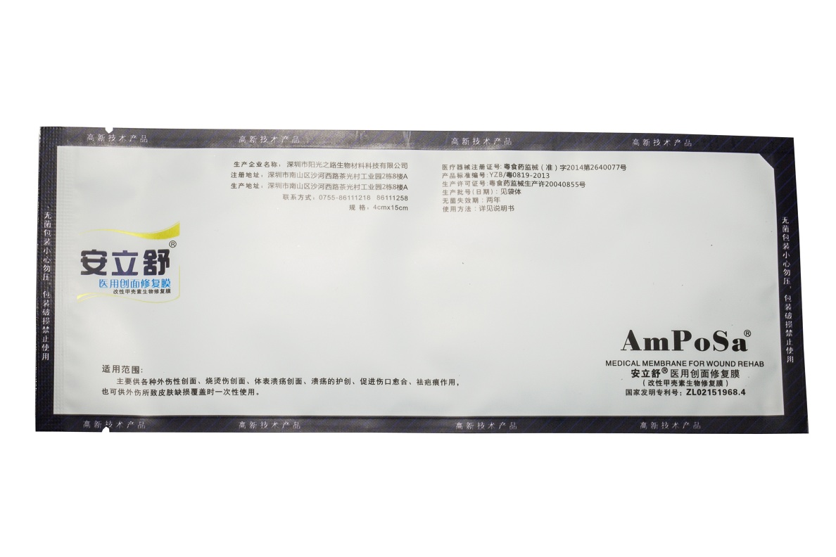 本产品由辅料层(主要成分改性甲壳素)及上下两面各粘附一层聚乙烯薄膜隔离层组成