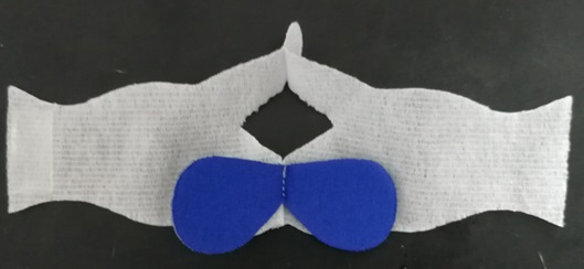 产品由眼罩和眼罩固定两部分组成,眼罩是由蓝黑物理复合布制成,眼罩固定部分为弹性无纺布、柔软魔术贴制成