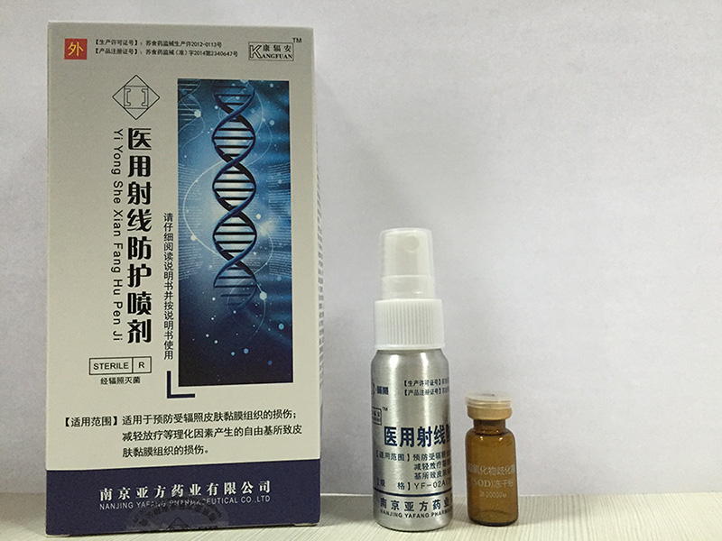 适用范围:预防受辐照皮肤粘膜组织的损伤;减轻放疗等理化因素产生的自由基所致皮肤黏膜组织的损伤。;备注:产品性能结构及组成:医用射线防护喷剂由喷瓶和喷剂组成。防护喷剂主要组成部分:0.00025%超氧化物歧化酶(SOD)、0.1%维生素B12、0.5%山梨酸钾、2.5%山梨醇、2%SOD稳定剂。基本参数:喷剂pH值:5.5~7.5,喷剂的SOD活力不得低于1000单位/mL.产品应无菌。;主治功效:预防受辐照皮肤粘膜组织的损伤;减轻放疗等理化因素产生的自由基所致皮肤黏膜组织的损伤。;规格描述:YF-02A(20ml/瓶);技术优势:超氧化物歧化酶(SOD)在临床上主要用于延缓人体衰老,防止色素沉着,消除局部炎症及辐射防护,是很有临床价值的治疗酶。SOD具有许多独特的生物学特性和生理学功能,但天然的SOD分子量较大、不易吸收,半衰期短,稳定性差、容易受外界环境影响,免疫原性等因素限制了SOD的临床应用。为解决这些问题,与市场上其他同类产品相比,我公司采用了经过化学修饰的超氧化物歧化酶(SOD)来延长半衰期、增强酶的稳定性、降低酶的免疫原性,从而使产品真正达到抗氧化、预防和减轻因辐射引起的皮肤黏膜损伤的目的。;
